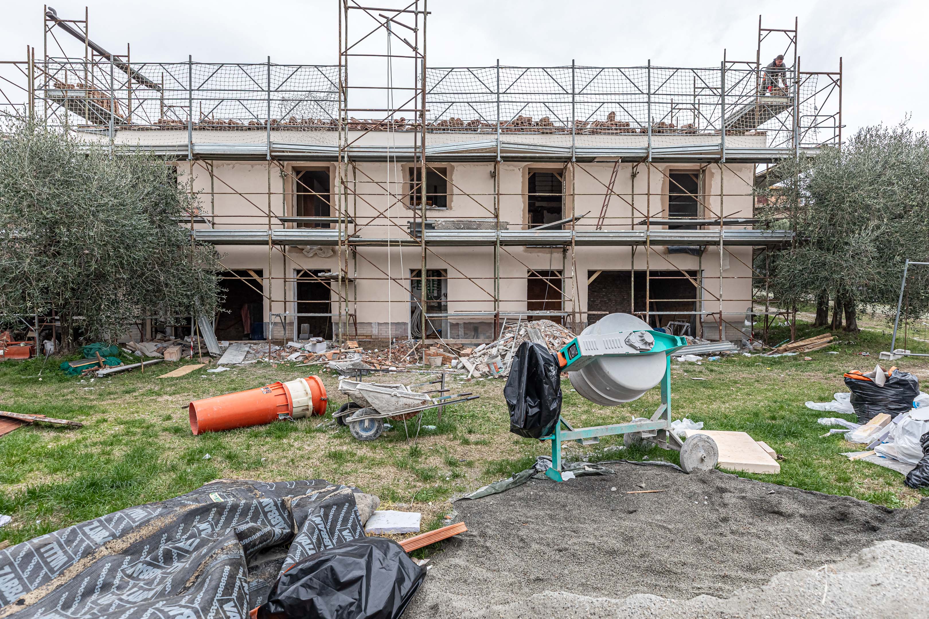 Il cantiere ha inoltre previsto il consolidamento delle strutture del fabbricato, a partire dal solaio di copertura, unito a tanti piccoli interventi finalizzati a garantire sicurezza su dettagli strutturali realizzati a metà del Novecento e pertanto bisognosi di cura. Altro aspetto importante ha riguardato la scelta dei materiali di finitura e rivestimento, e il matching dei loro colori, sia in facciata esterna, che all’interno dei singoli ambienti. Anche in questo caso abbiamo privilegiato la scelta di materiali naturali poco processati e privi di inquinanti indoor.