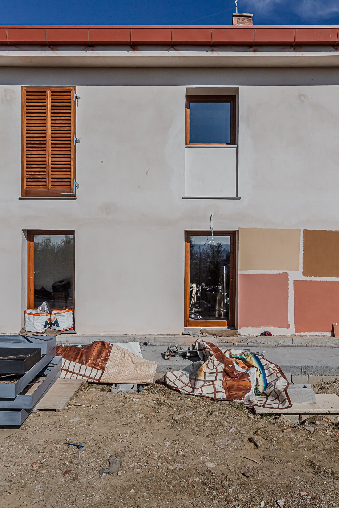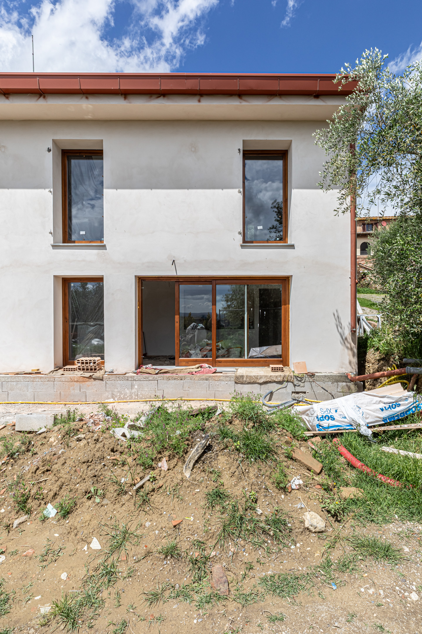E’ possibile utilizzare un intervento di riqualificazione energetica per trasformare radicalmente un edificio al suo esterno? Certamente. Noi abbiamo previsto la posa di un cappotto termico in pannelli di silicato di calcio, che ha in prima battuta eliminato preesistente finitura di scarsa qualità a mattoni facciavista. Il cappotto termico, con spessore 14,0 cm, è stato poi rasato con un tonachino a grana medio-grande, per ottenere un effetto rurale, e tinteggiato nei colori del mattone. Contemporaneamente, un intervento di revisione totale delle bucature di facciata ha disegnato un nuovo spartito di portefinestre affacciate sul lato meridionale, per garantire luce naturale negli interni e una vista amplificata del paesaggio esterno dai vari ambienti della casa.