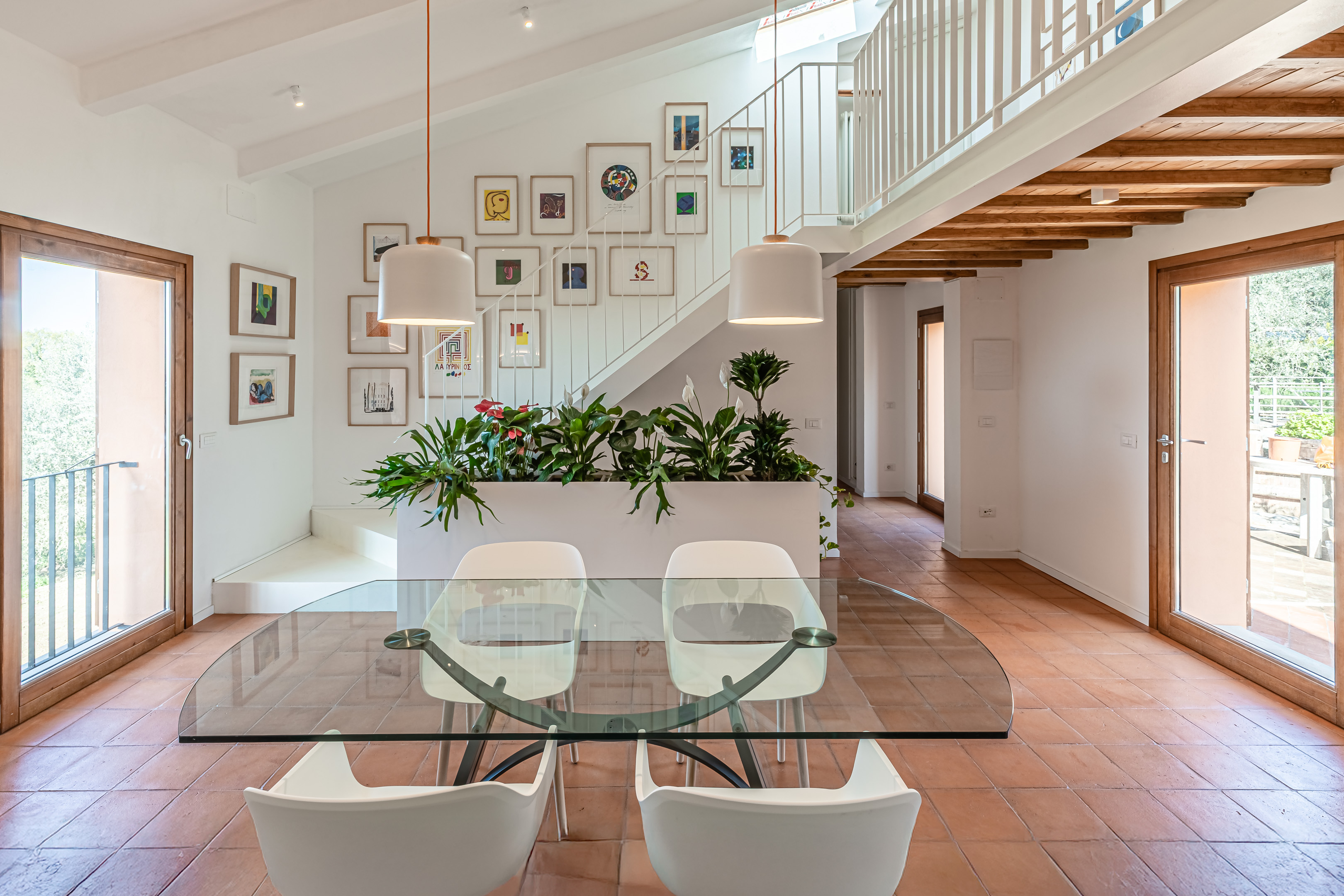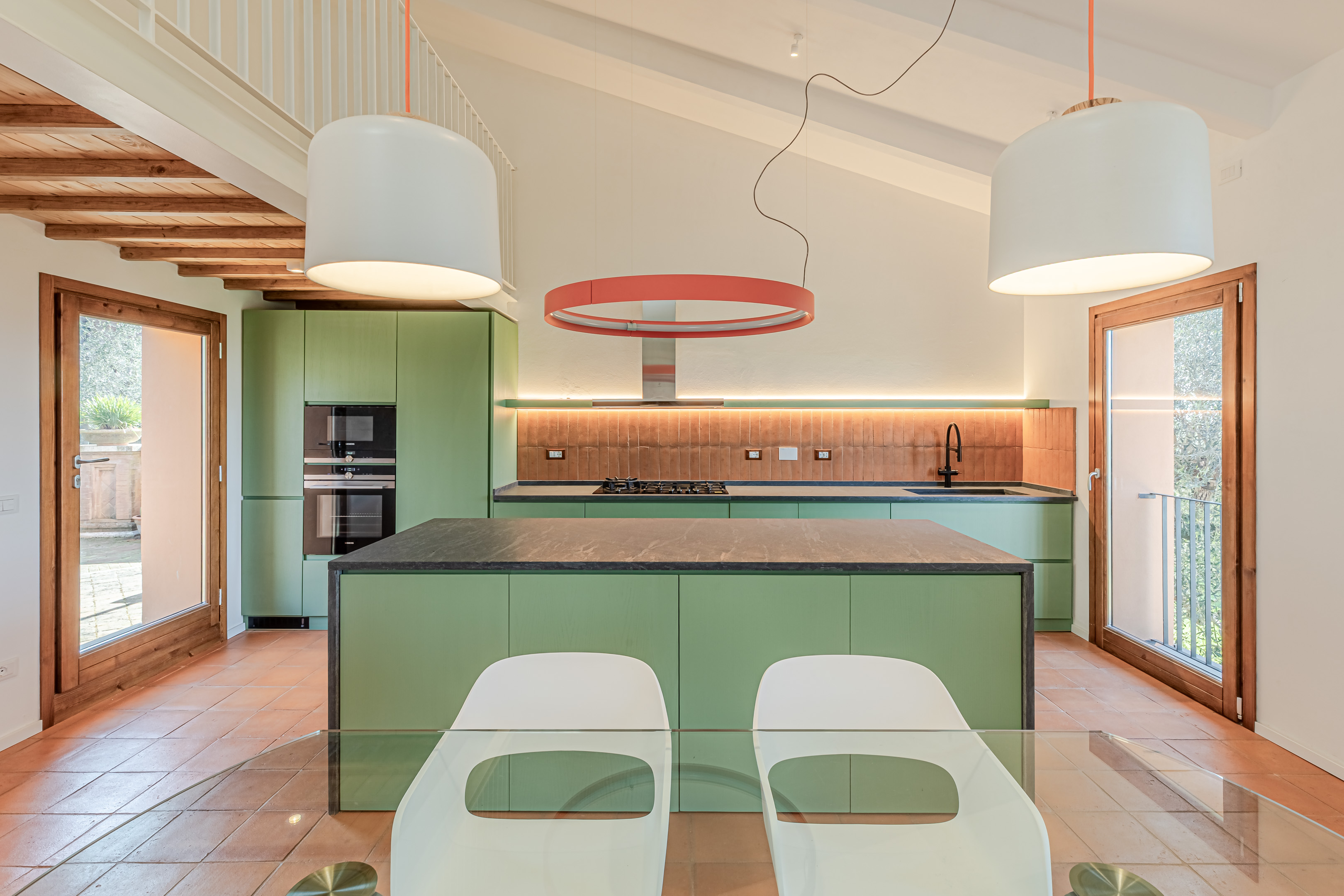 Il nuovo open space include lo spazio del pranzo, ed una grande cucina con isola realizzata su nostro disegno. La scala che porta al soppalco superiore, realizzata in lamiera di acciaio piegato, è sottolineata mediante una grande fioriera anch’essa in acciaio, che funge anche da parapetto della scala. Un unico grande pavimento in piastrelle di cotto fatto a mano 30×30 cm riscalda l’ambiente, e dialoga con il verde salvia della cucina e con i top in pietra grigia di Cardoso, mentre tutto l’involucro è stato tinteggiato di bianco per garantire serenità e luminosità all’ambiente. I nuovi infissi termici in legno completano la palette dei colori, contribuendo ad elevbare le prestazioni invernali ed estive della casa.