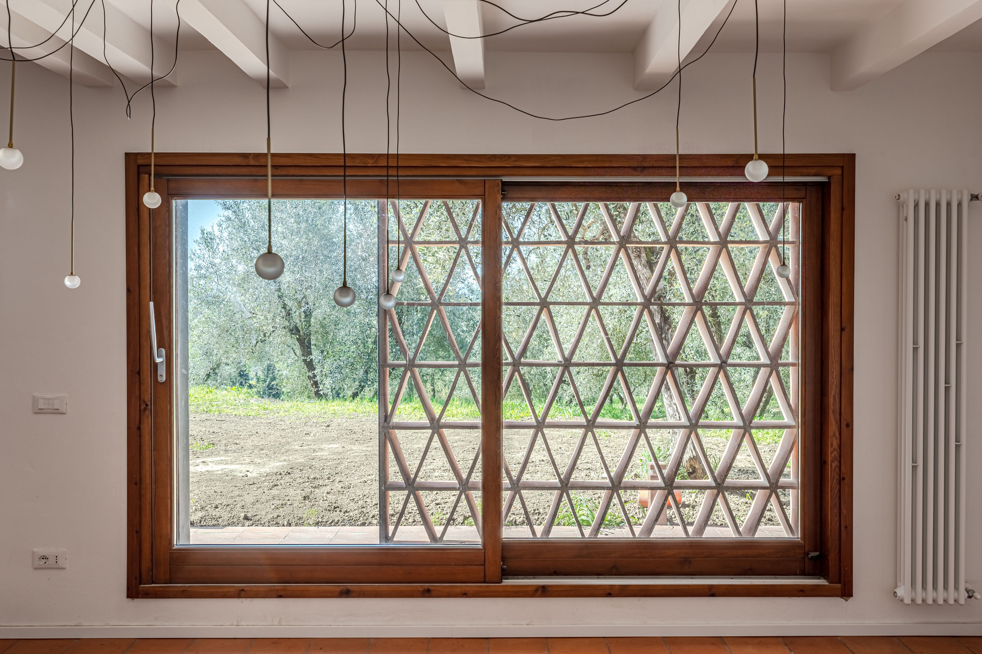 Il sistema delle “gelosie” è stato progettato a partire da telai di acciaio brunito che contengono il graticcio composto in questo caso da pianelle di cotto di Impruneta fatto a mano di dimensioni 15×30 cm. Questa controparete si sviluppa lungo tutto il piano inferiore del prospetto meridionale, interessando sia le porzioni cieche di muro, che le porzioni dotate di aperture vetrate. L’aggetto della controparete e la trama delle pianelle garantiscono una efficiente limitazione dell’ingresso dei raggi solari nelle ore più calde della stagione estiva, mentre permettono il passaggio della luce nella stagione invernale, quando i raggi solari sono più bassi sull’orizzonte.