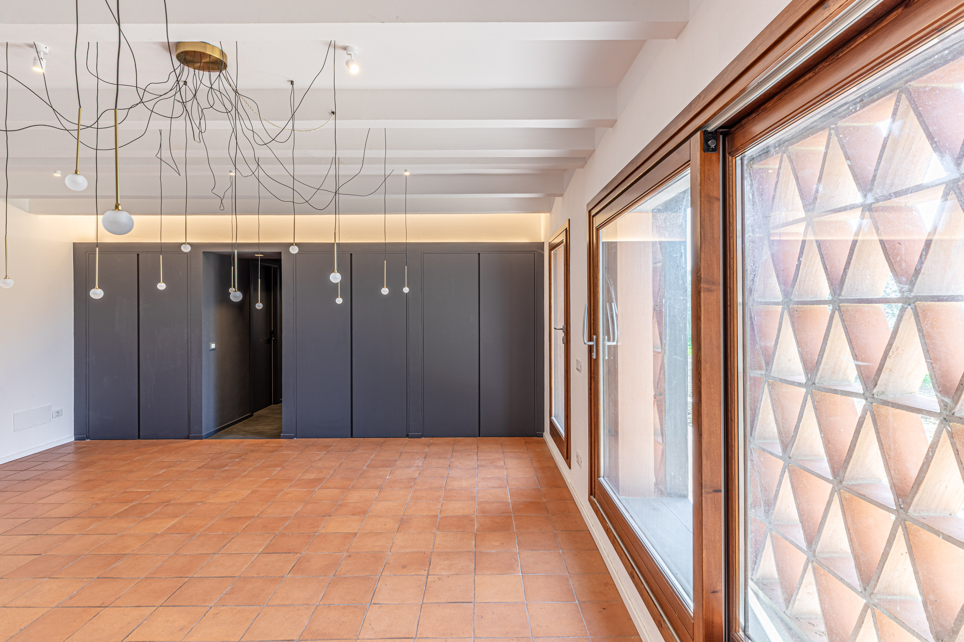 Tutta la zona contenente gli ambienti di servizio (bagno, vani tecnici impiantistici) è situata nella parte centrale del piano seminterrato, ed è caratterizzata da una tinteggiatura color grigio. Il grande ambiente occidentale è dotato di una grande armadiatura realizzata su disegno con sportelli ad anta che permette lo stoccaggio di materiale vario. I grandi ambienti sono continui, e dotati di una pavimentazione in piastrelle di cotto fatto a mano 30×30 cm che rende lo spazio caldo ed accogliente. I giochi della luce solare che attraversa le gelosie arricchiscono gli spazi creando differenti disegni e differenti toni di luce al passare dei giorni e delle stagioni, sulla base dell’intensità e dell’inclinazione dei raggi solari.