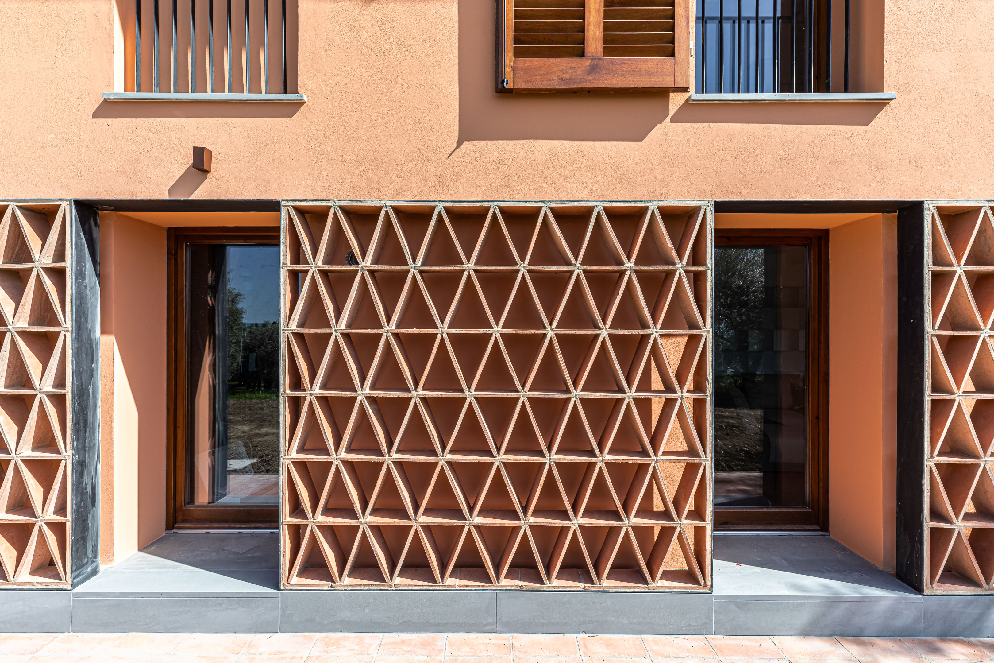 Oltre all’isolamento del solaio di copertura, realizzato ad unica falda esposta sud, il progetto ha quindi previsto un sistema di schermature solari sia fisse che mobili per garantire protezione dal calore e gestire l’ingresso del raggi solari. Il piano superiore è quindi dotato di persiane classiche, tipiche delle abitazioni della zona, mentre per il piano terra si è progettato un sistema di schermature solari derivato dal lessico rurale della zona, le cosiddette “gelosie”, una sorta di parete a graticcio realizzata con pianelle di cotto a formare un tipico disegno a triangoli, che veniva utilizzato negli annessi rurali per arieggiare gli ambienti interni utilizzati come magazzini per lo stoccaggio dei raccolti.