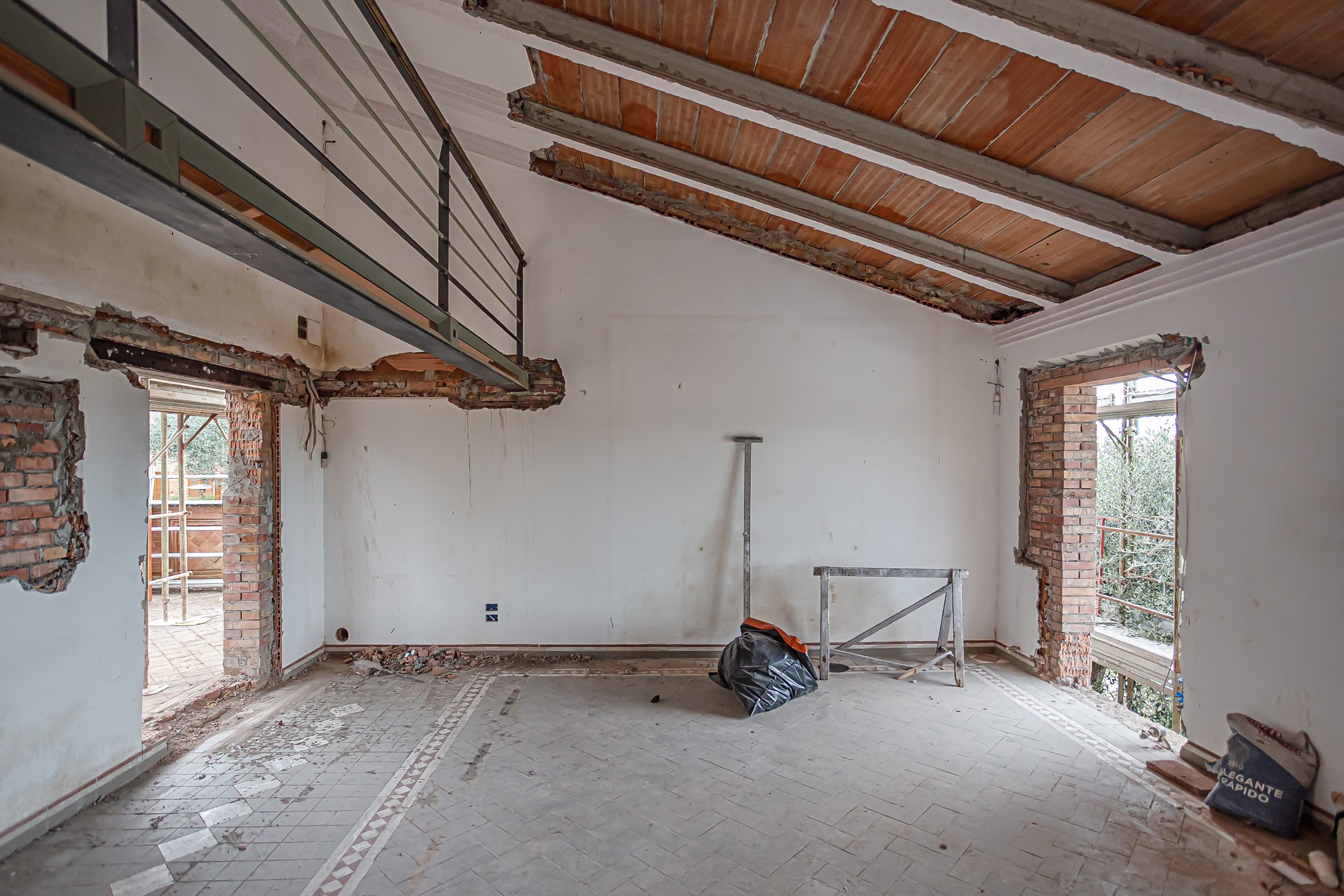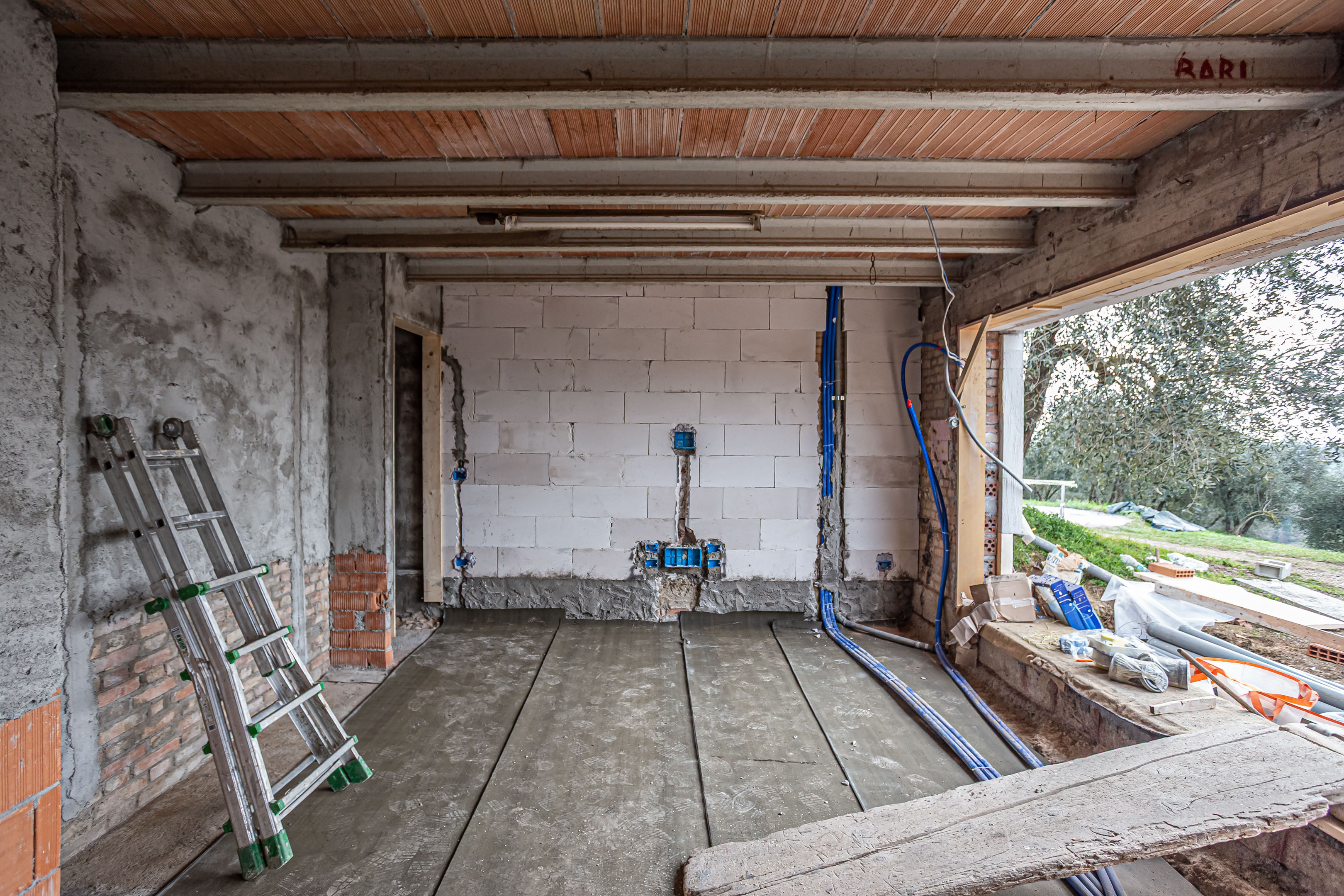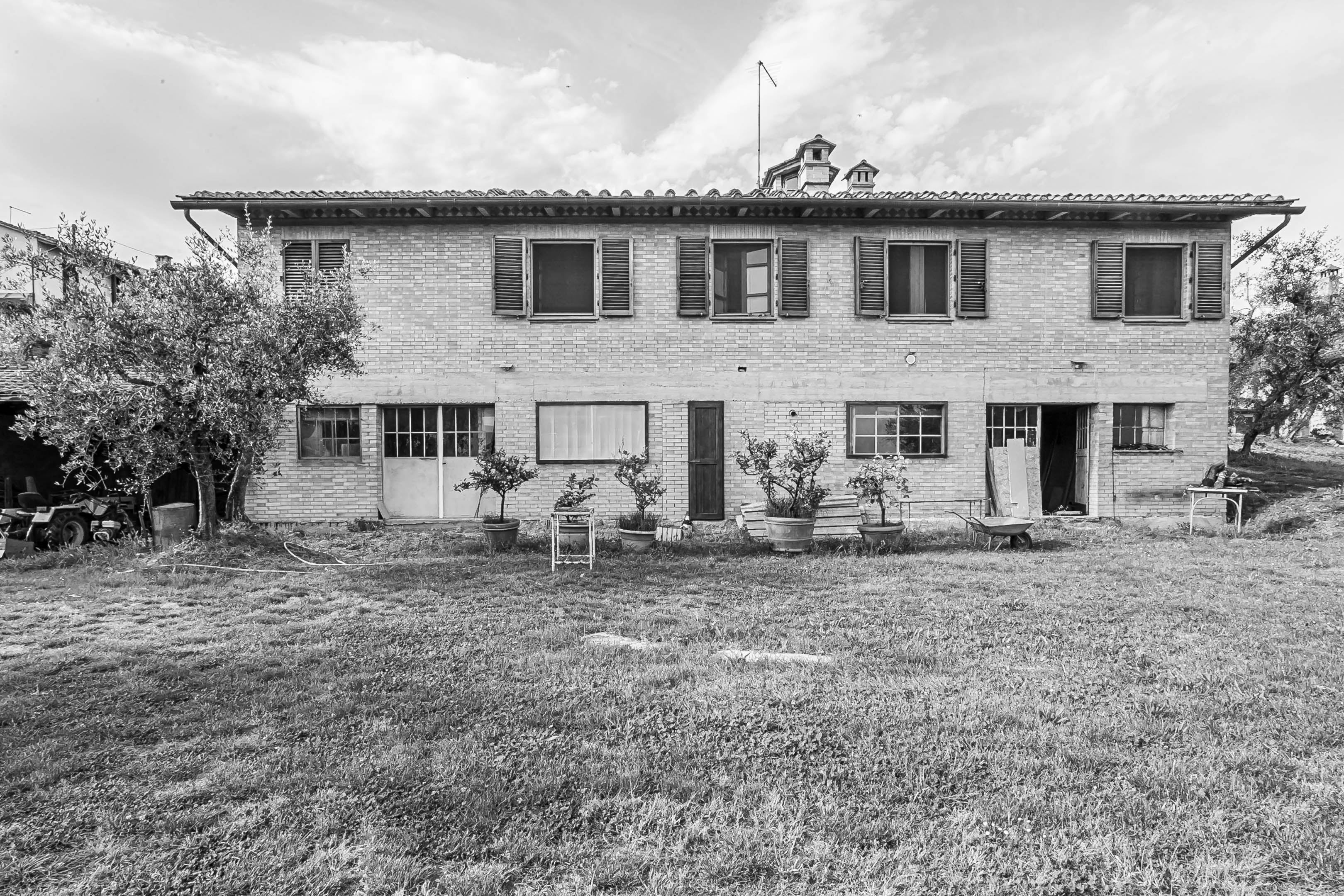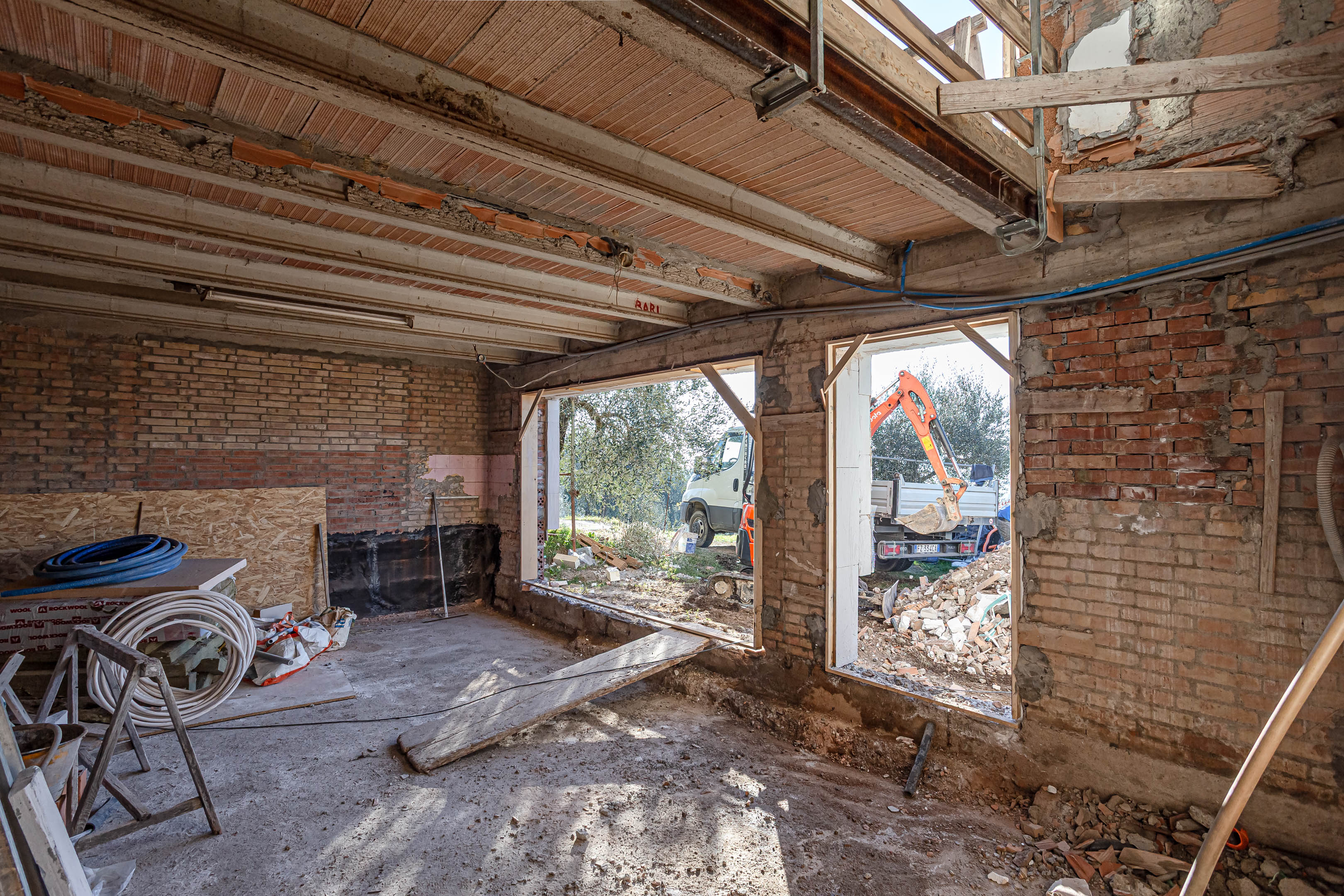 Gli ambienti interni si presentavano in parte al grezzo, e necessitavano pertanto di un intervento completo di ristrutturazione, anche per il rifacimento integrale degli impianti. Le aperture esterne erano piccole e mal posizionate, con ambienti interni bui e scarsamente connessi con le aree esterne dell’aia posizionata a monte del fabbricato, e del grande giardino con ulivi posizionato a sud dello stesso.